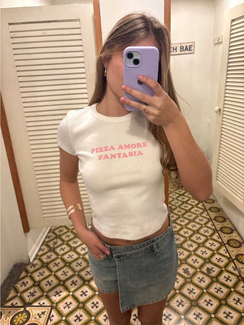 Polo grafico con cuello redondo, entalle pegado y corto. Lleva gráfico pizza amore fantasia.